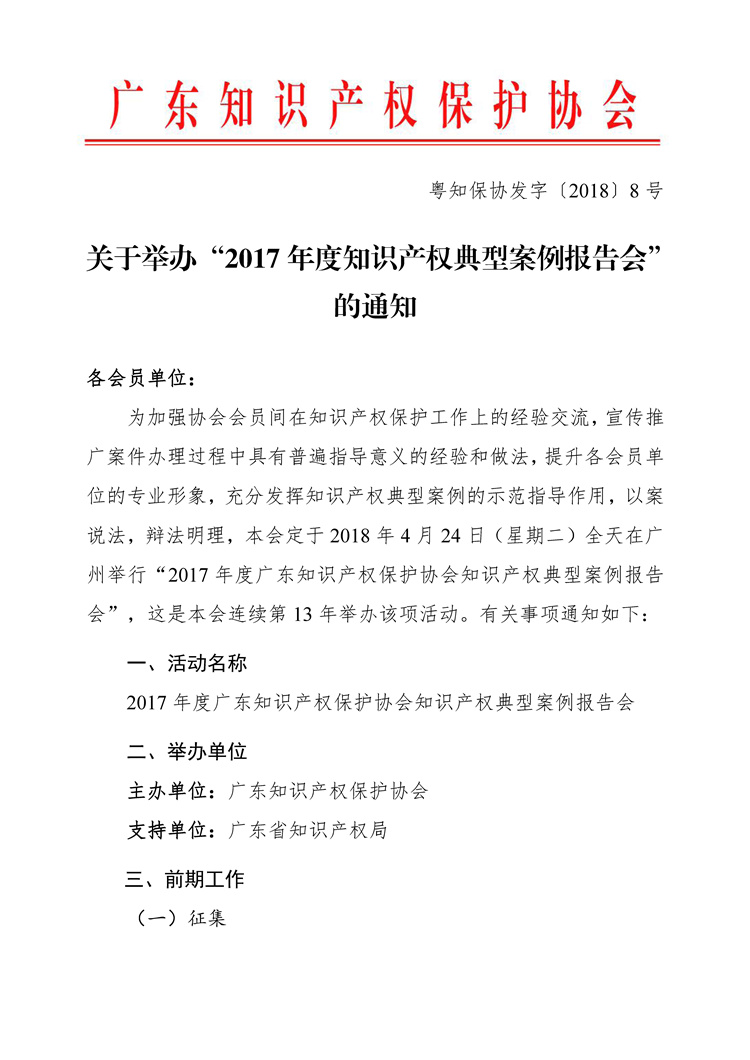 粤知保协发字〔2018〕8号--关于举办“2017年度知识产权典型案例报告会”的通知