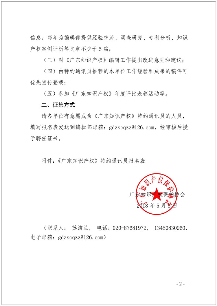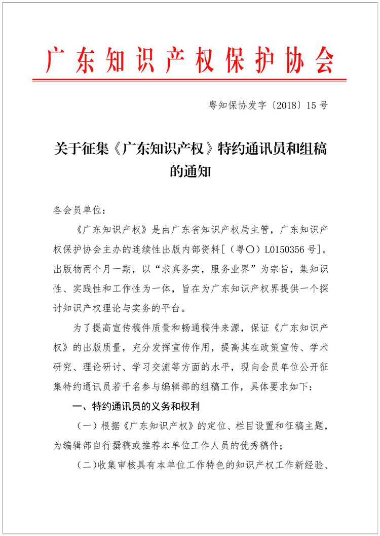 粤知保协发字〔2018〕15号-关于征集《广东知识产权》特约通讯员和组稿的通知