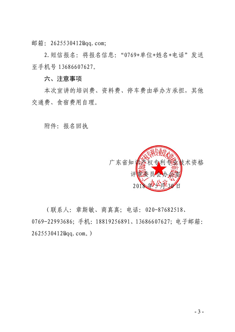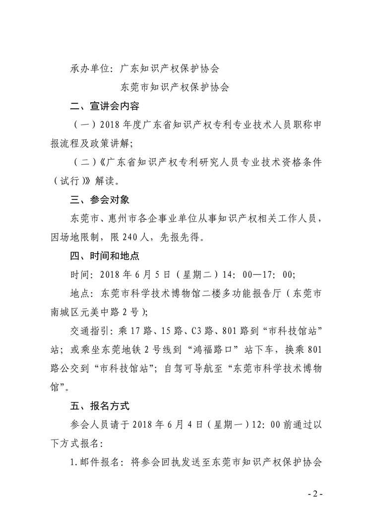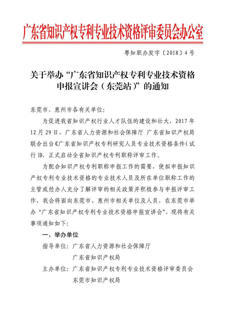 粤知职办发字〔2018〕4号-关于举办“广东省知识产权专利专业技术资格评审申报宣讲会(东莞站)的通知”