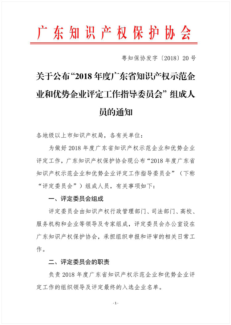 粤知保协发字〔2018〕20号-关于公布“2018年广东省知识产权示范企业和优势企业评定工作指导委员会”组成人员的通知