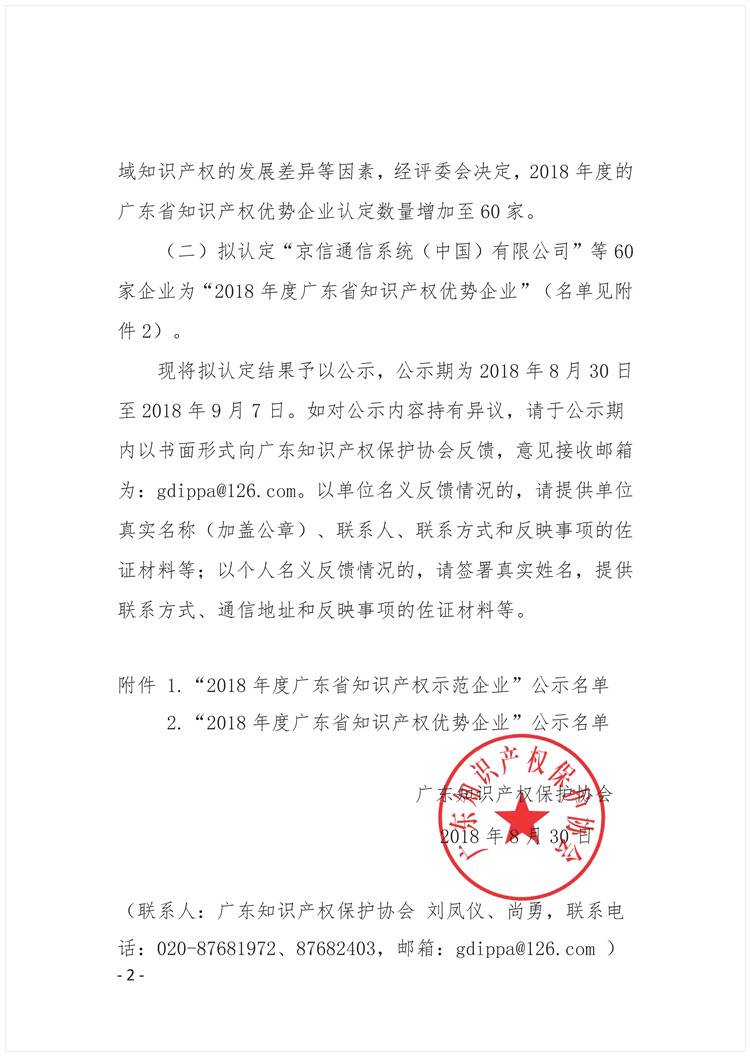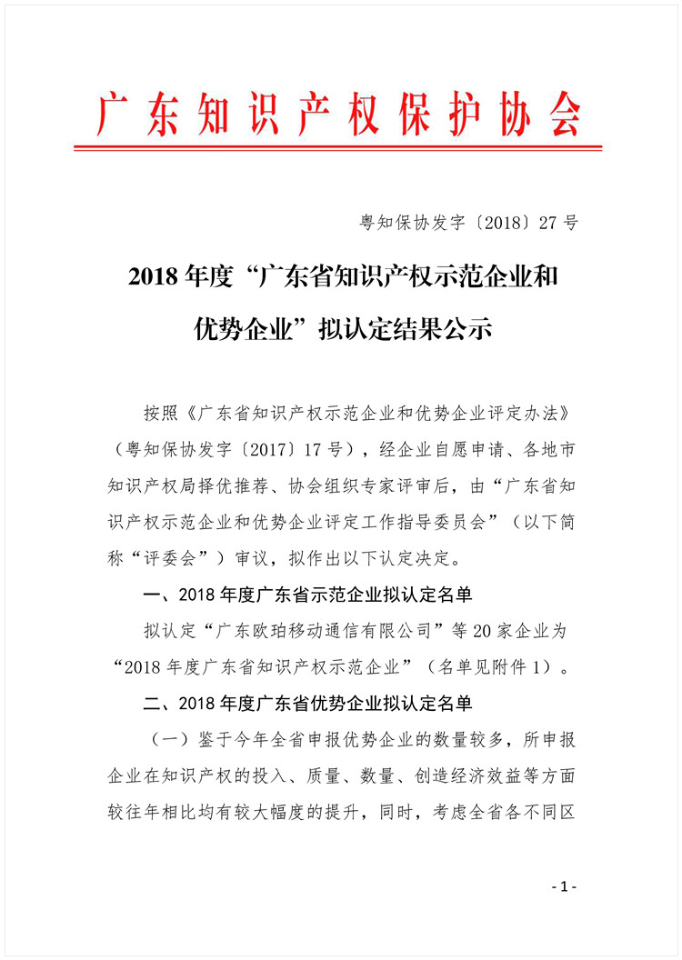 2018 年度“广东省知识产权示范企业和优势企业”拟认定结果公示