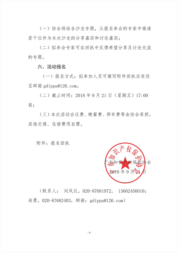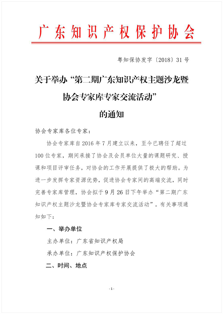 粤知保协发字〔2018〕31号-关于举办“第二期广东知识产权主题沙龙暨协会专家库专家交流活动”的通知