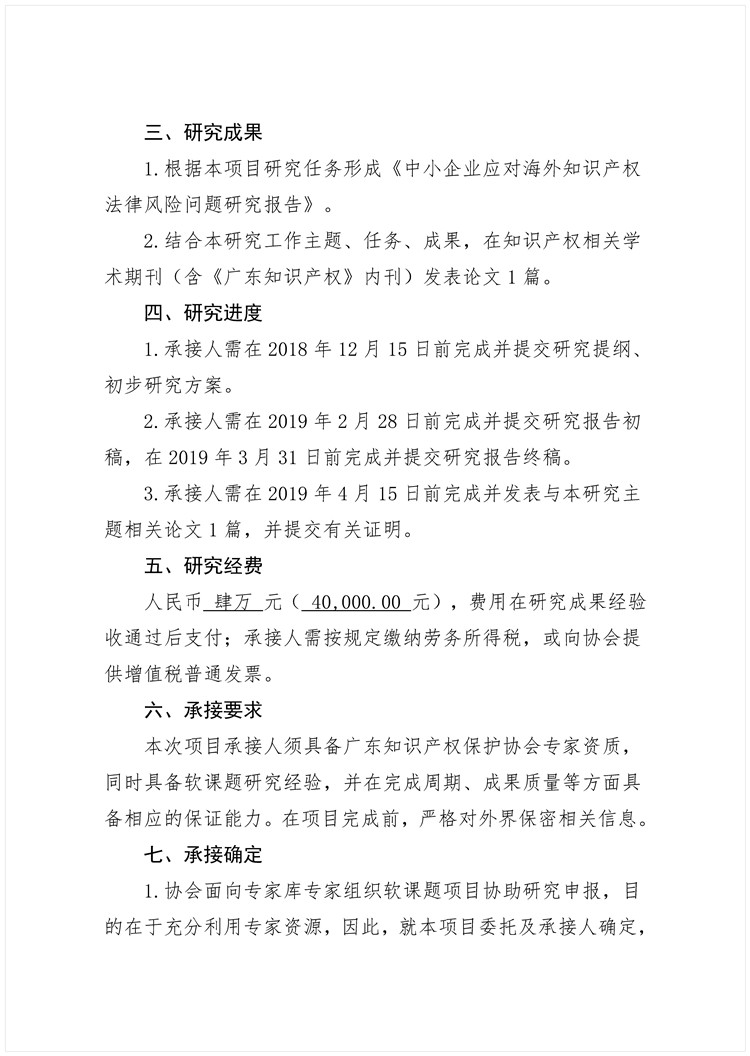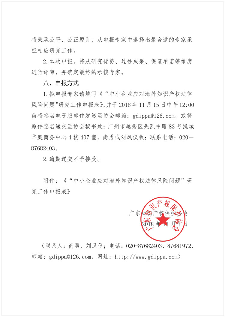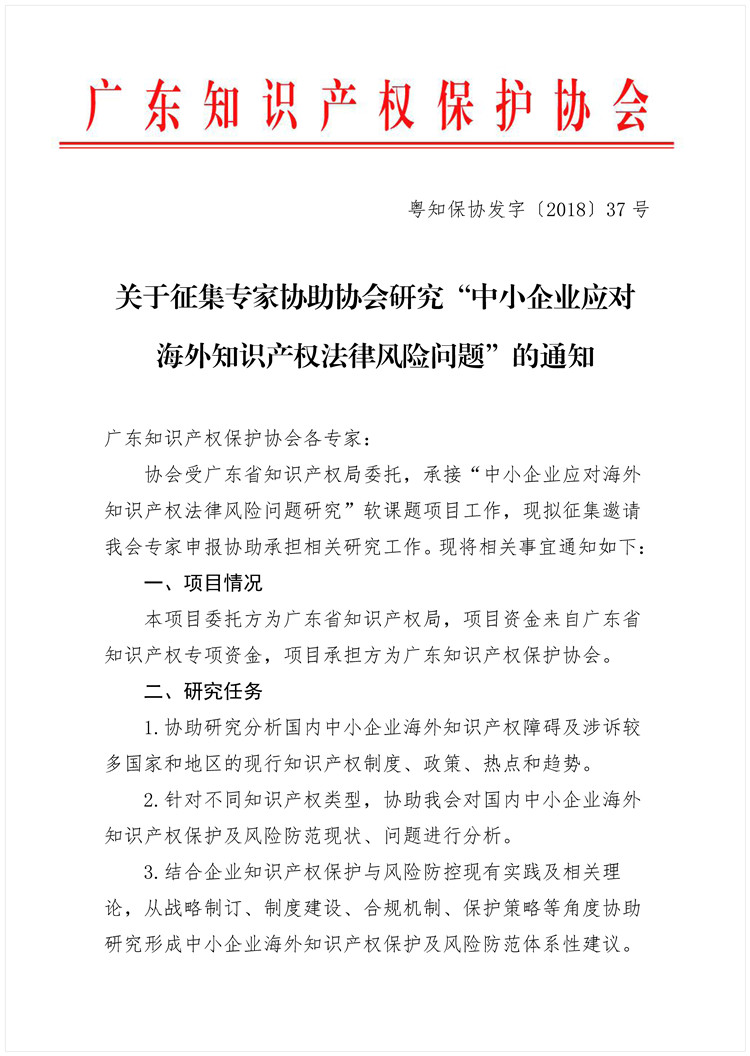 粤知保协发字〔2018〕37号-关于征集专家协助协会研究“中小企业应对海外知识产权法律风险问题”的通知