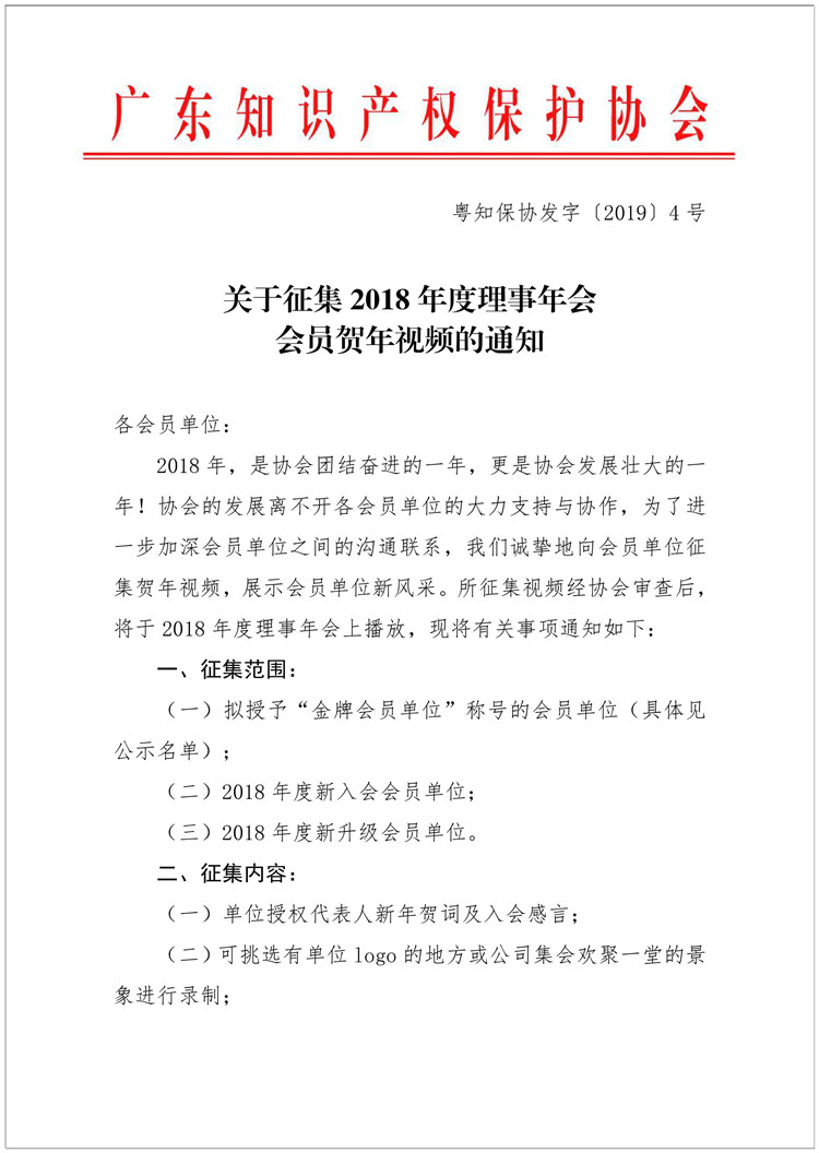 粤知保协发字〔2019〕4号-关于征集2018年度理事年会会员贺年视频的通知