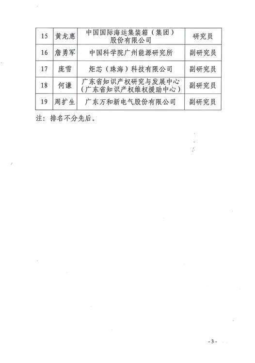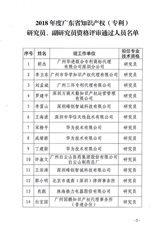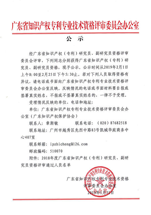 广东省知识产权专利专业技术资格评审委员会办公室关于2018年度广东省知识产权(专利)研究员、副研究员资格评审通过人员名单的公示