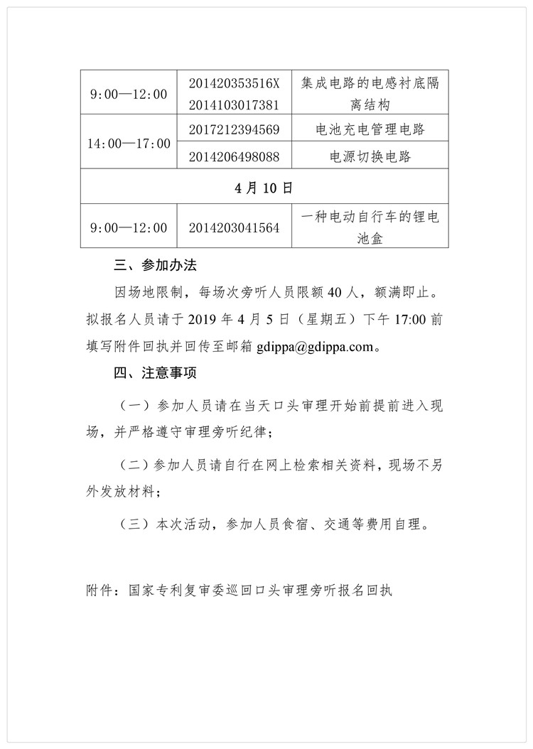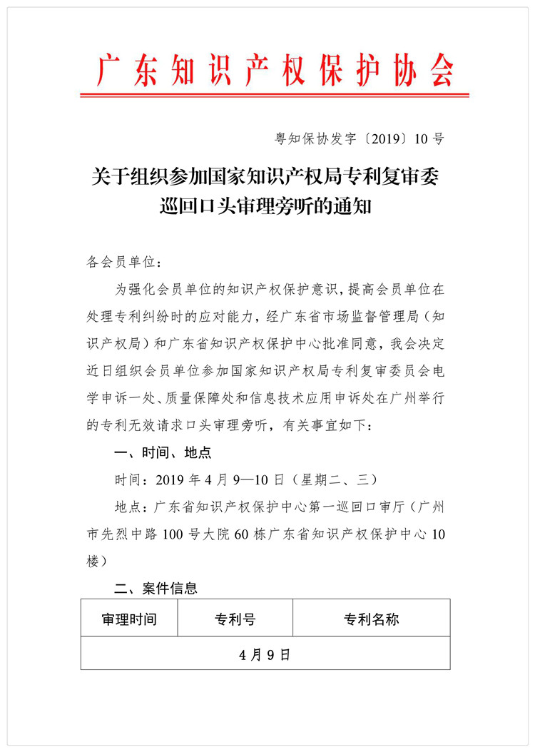 粤知保协发字〔2019〕10号-关于组织参加国家专利复审委巡回口头审理旁听的通知