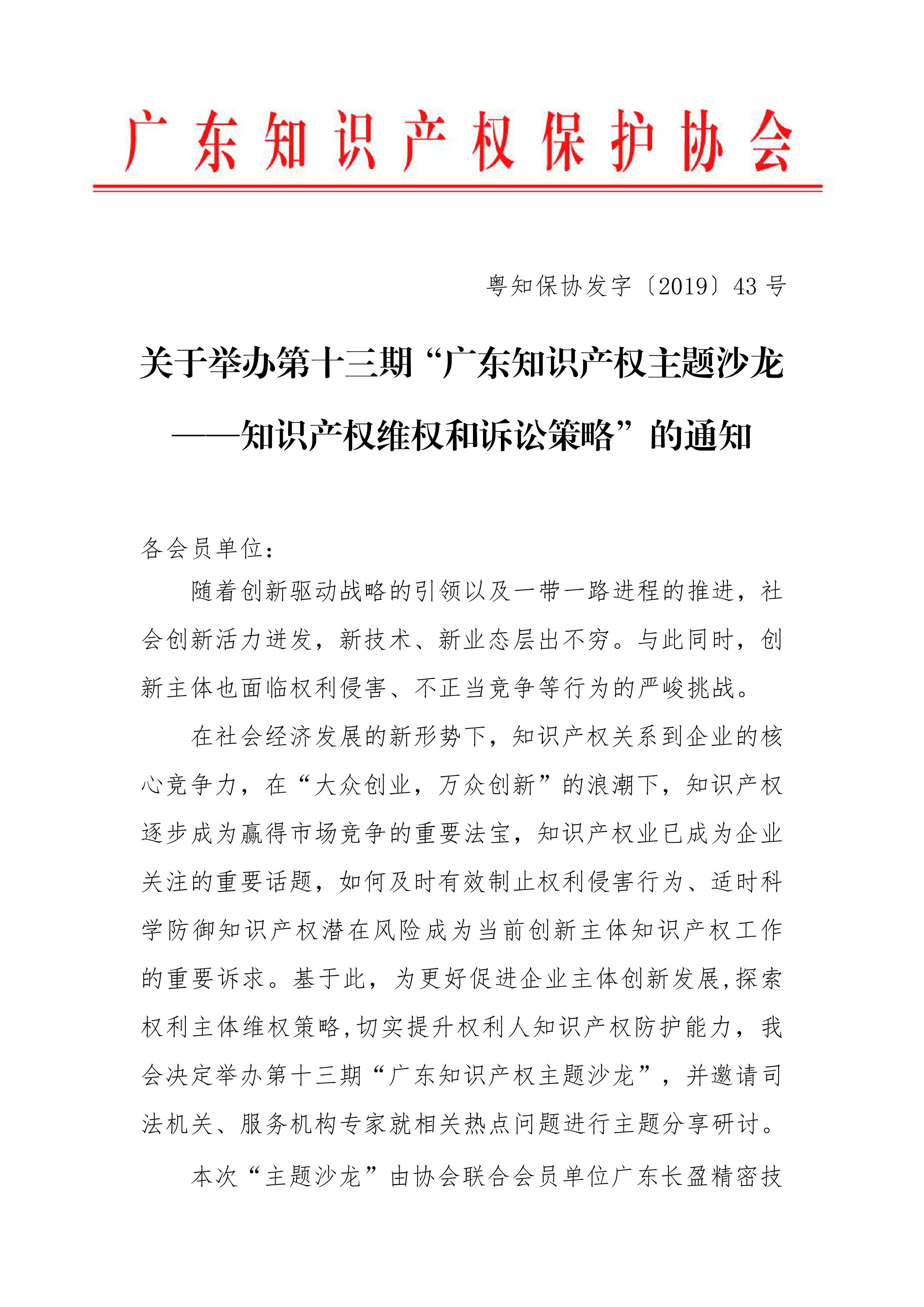 粤知保协发字〔2019〕43号-关于举办第十三期“广东知识产权主题沙龙——知识产权维权和诉讼策略“的通知