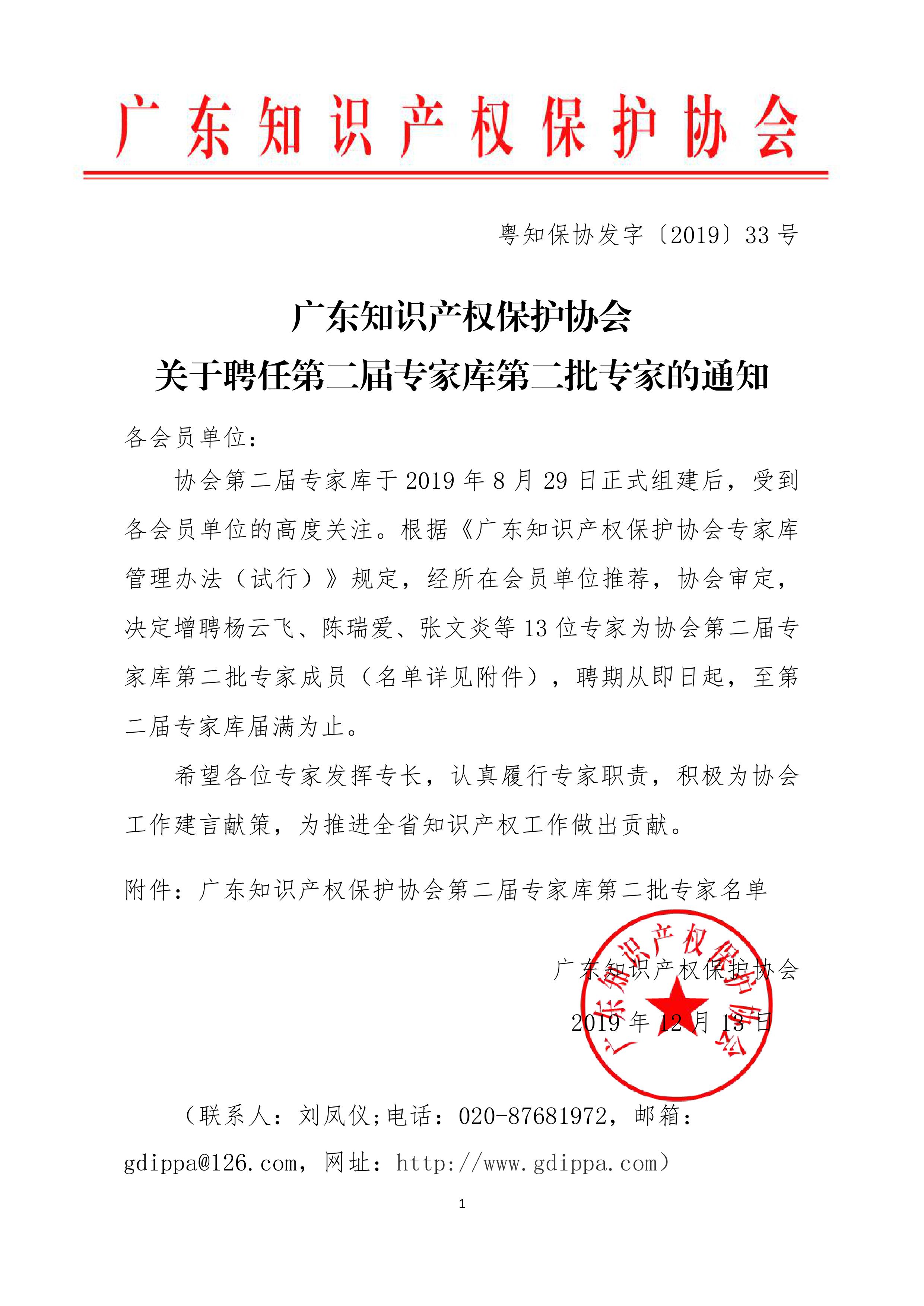 粤知保协发字〔2019〕46号-广东知识产权保护协会关于聘任第二届专家库第二批专家的通知