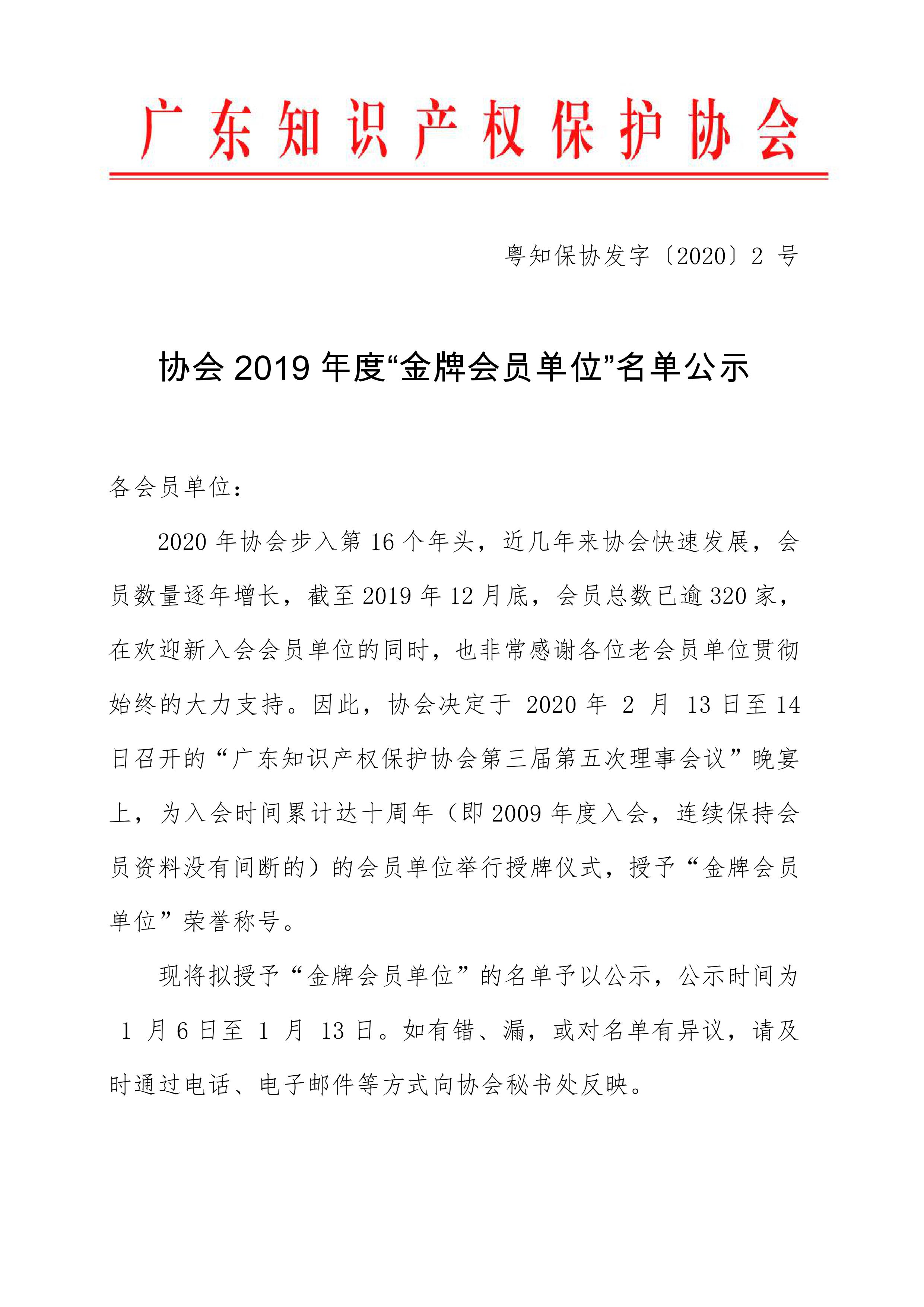 粤知保协发字〔2020〕2号-拟授予协会“金牌会员单位”名单的公示