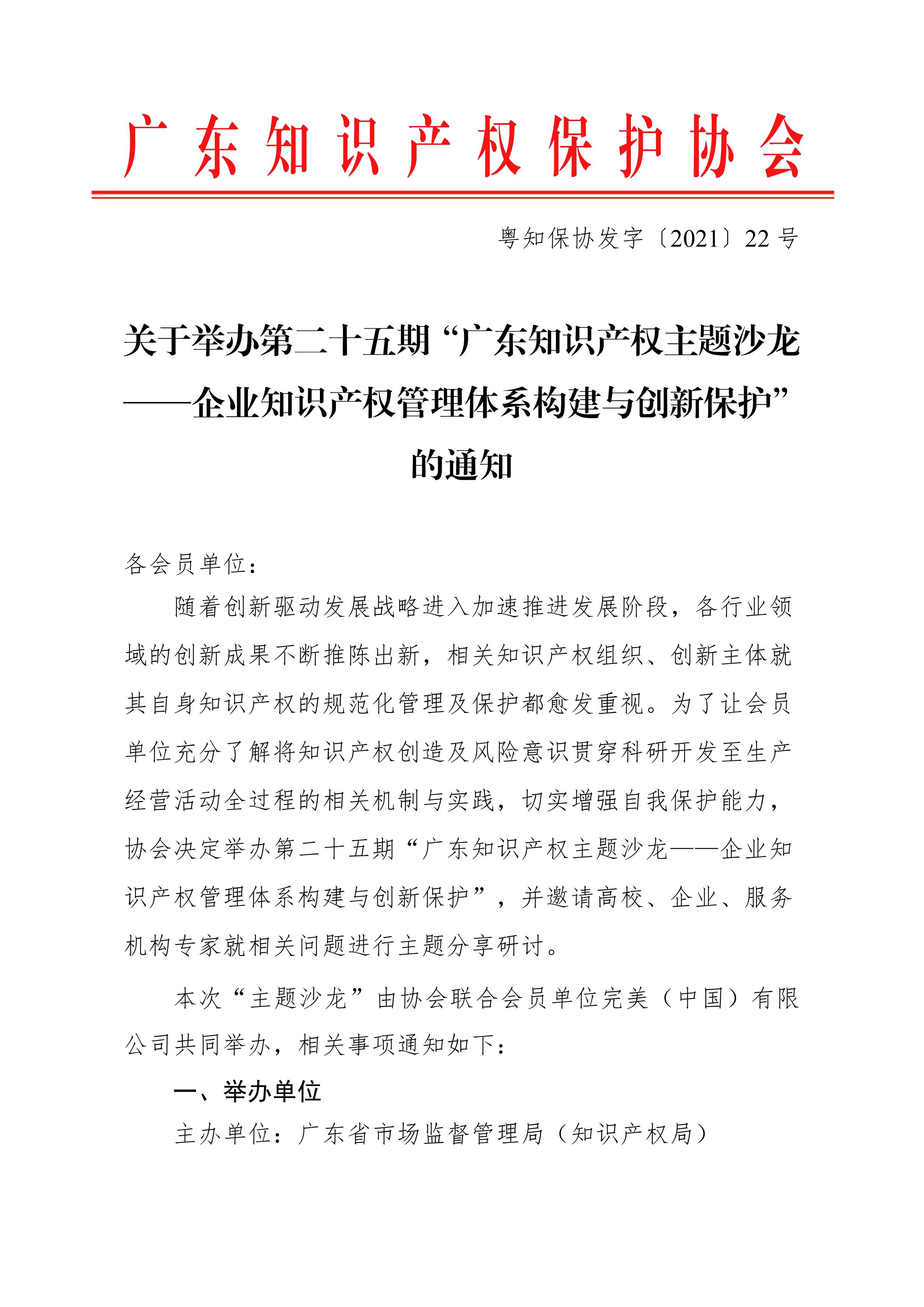 粤知保协发字〔2021〕22号-关于举办第二十五期“广东知识产权主题沙龙——企业知识产权管理体系构建与创新保护“的通知