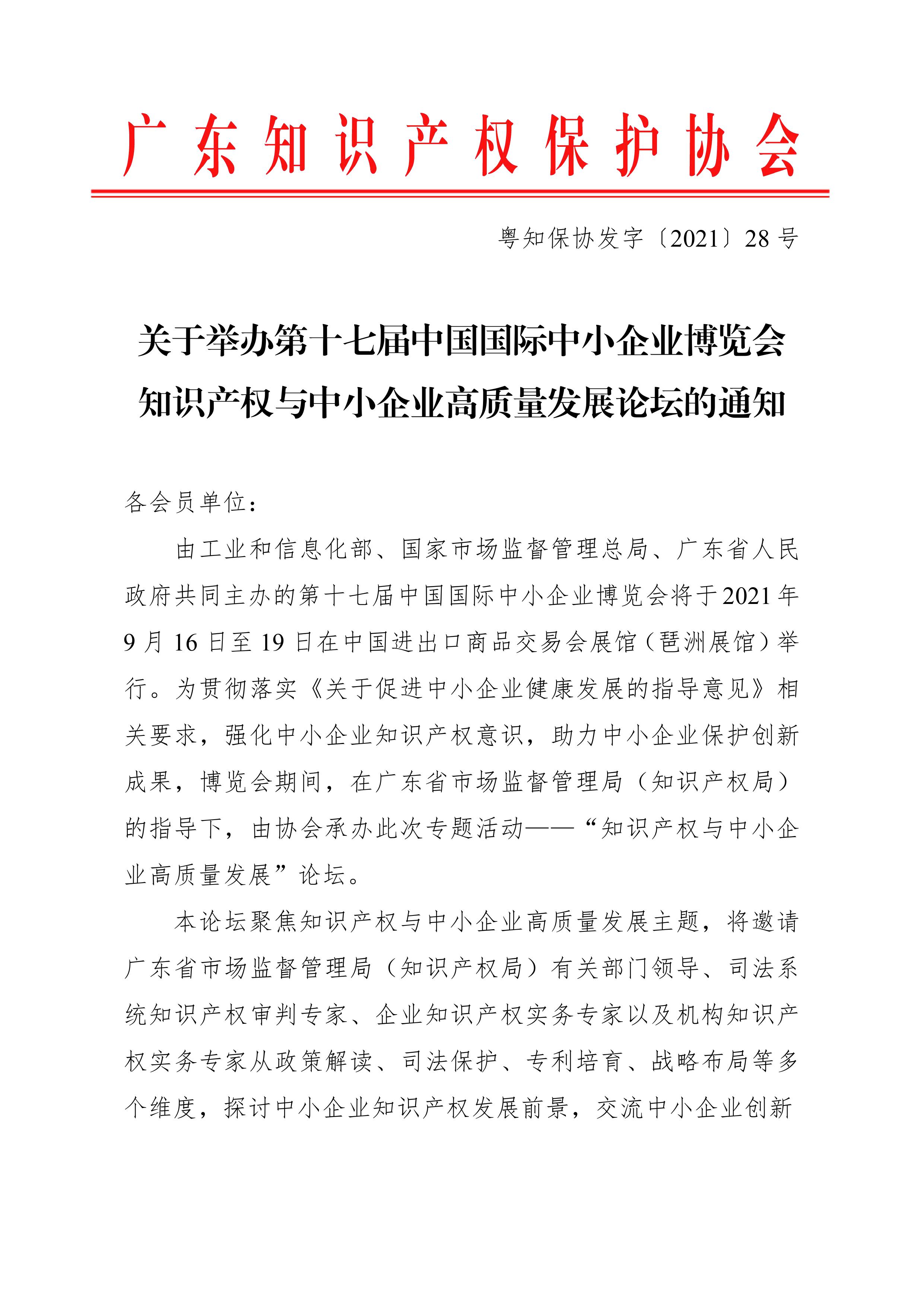 粤知保协发字〔2021〕28号-关于举办第十七届中国国际中小企业博览会知识产权与中小企业高质量发展论坛的通知