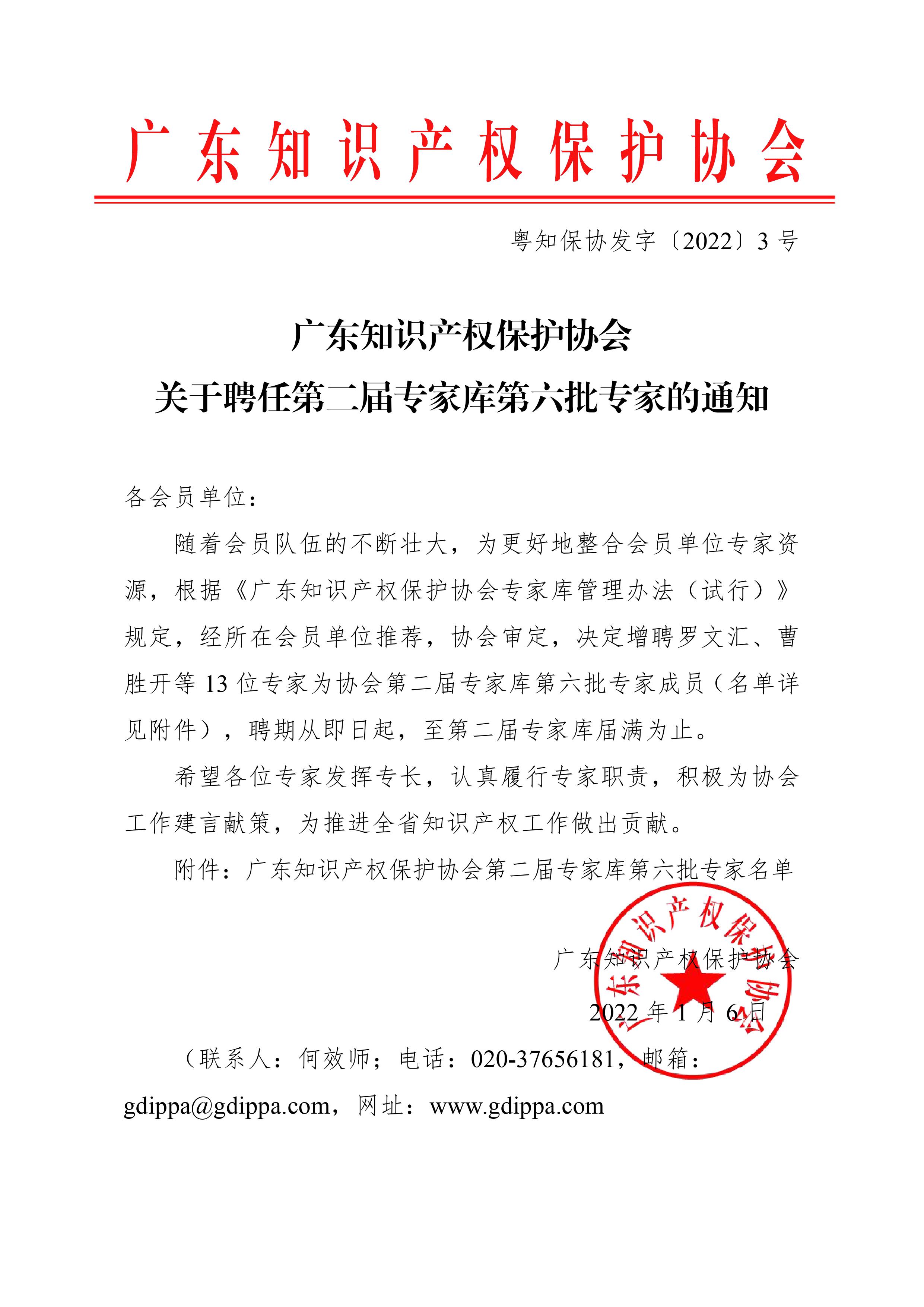 粤知保协发字〔2022〕3号-广东知识产权保护协会关于聘任第二届专家库第六批专家的通知