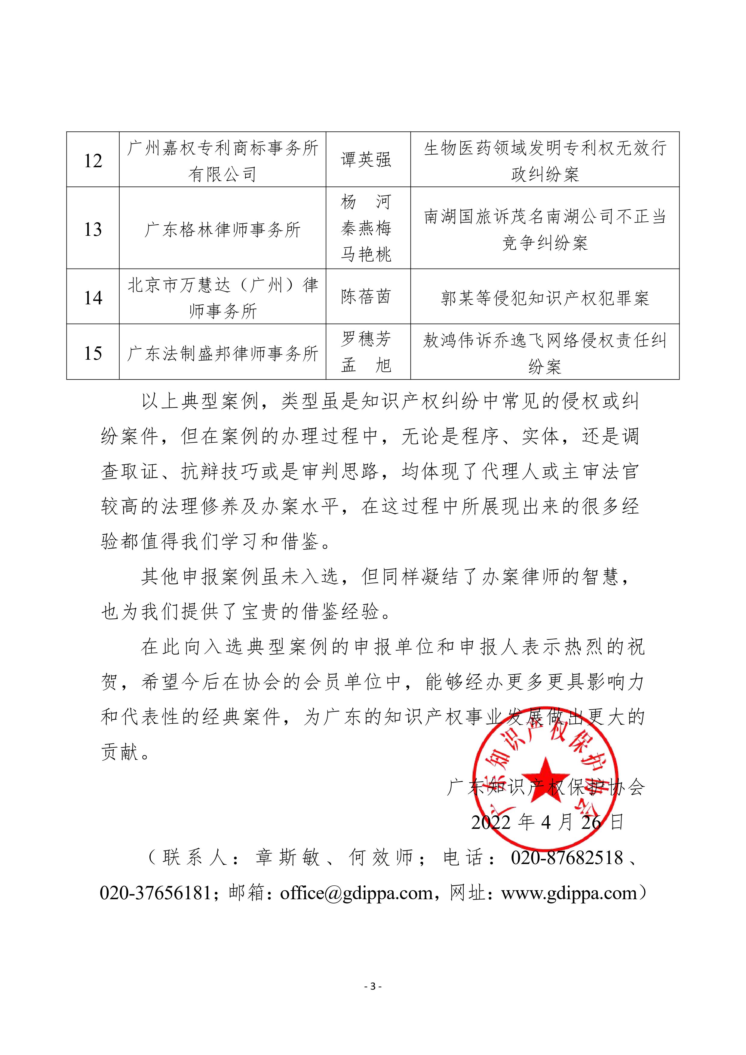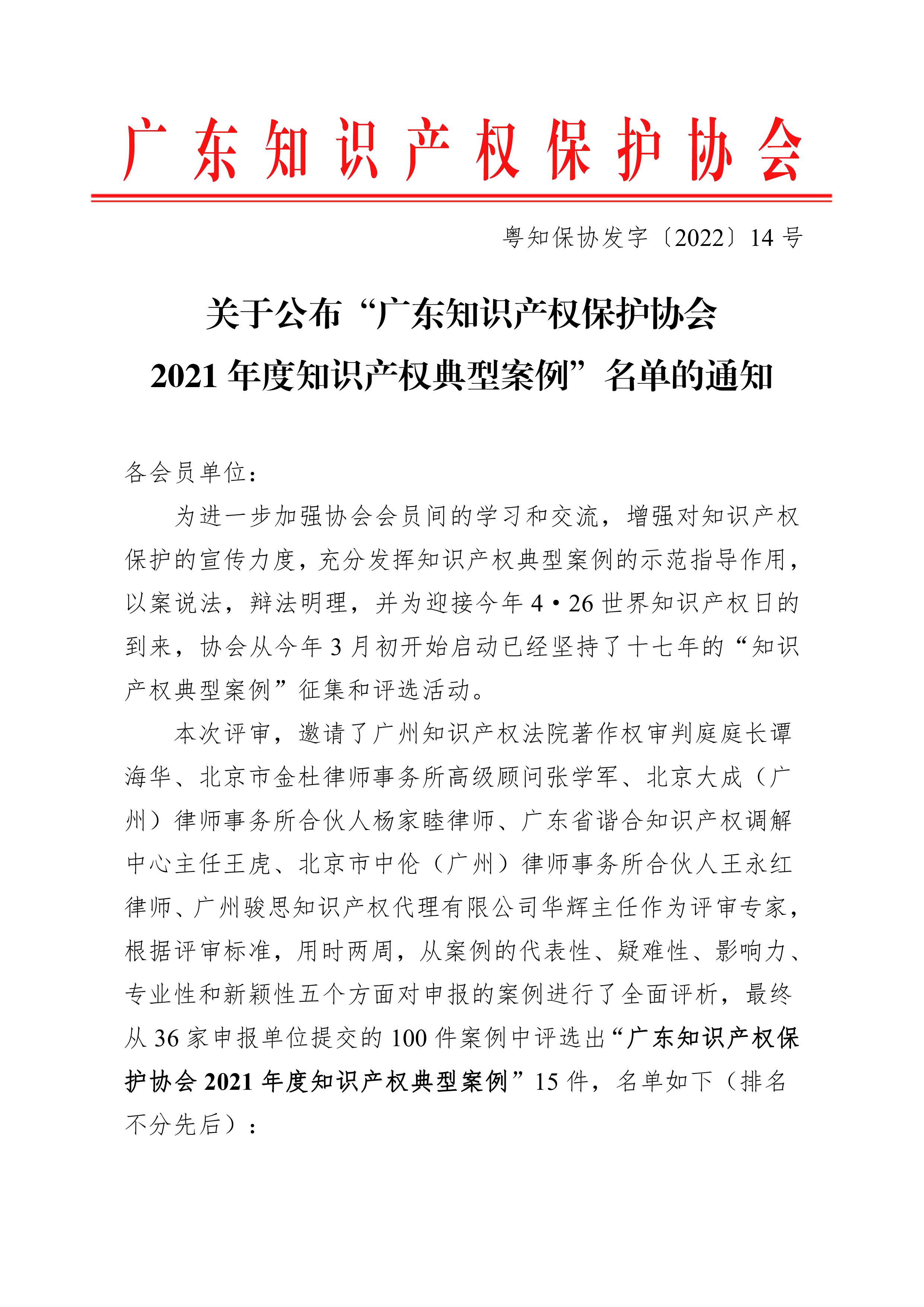 粤知保协发字〔2022〕14号-关于公布“广东知识产权保护协会2021年度知识产权典型案例”的通知