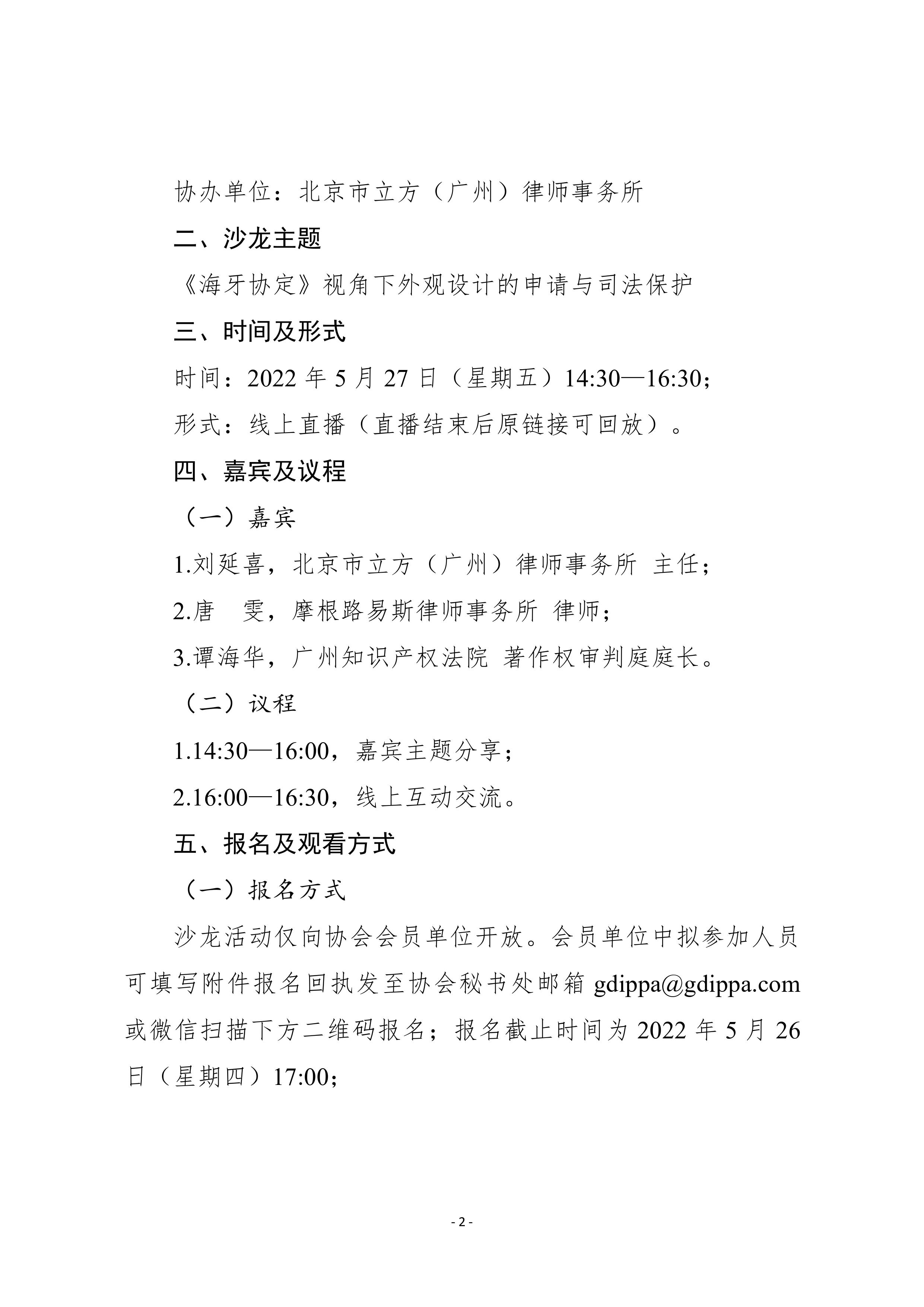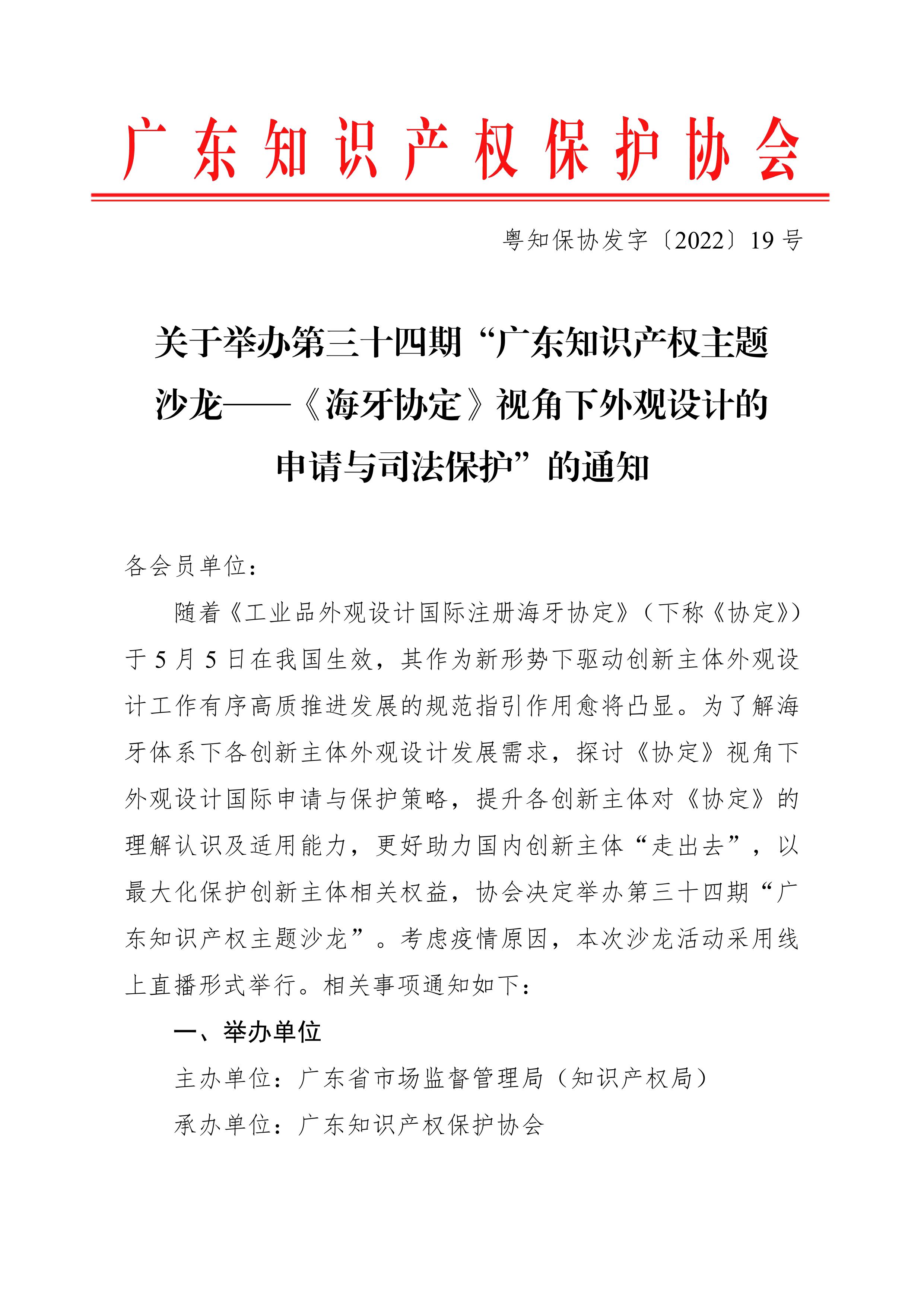 粤知保协发字〔2022〕19号-关于举办第三十四期“广东知识产权主题沙龙——《海牙协定》视角下外观设计的申请与司法保护”的通知