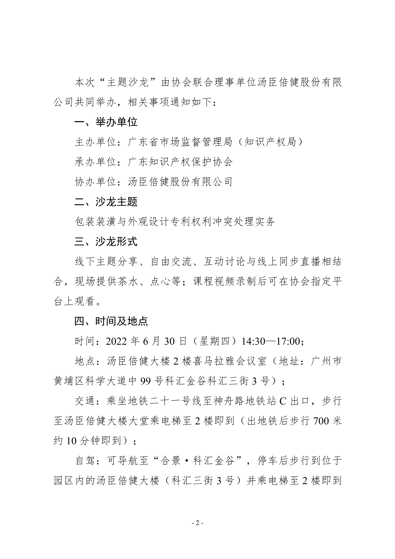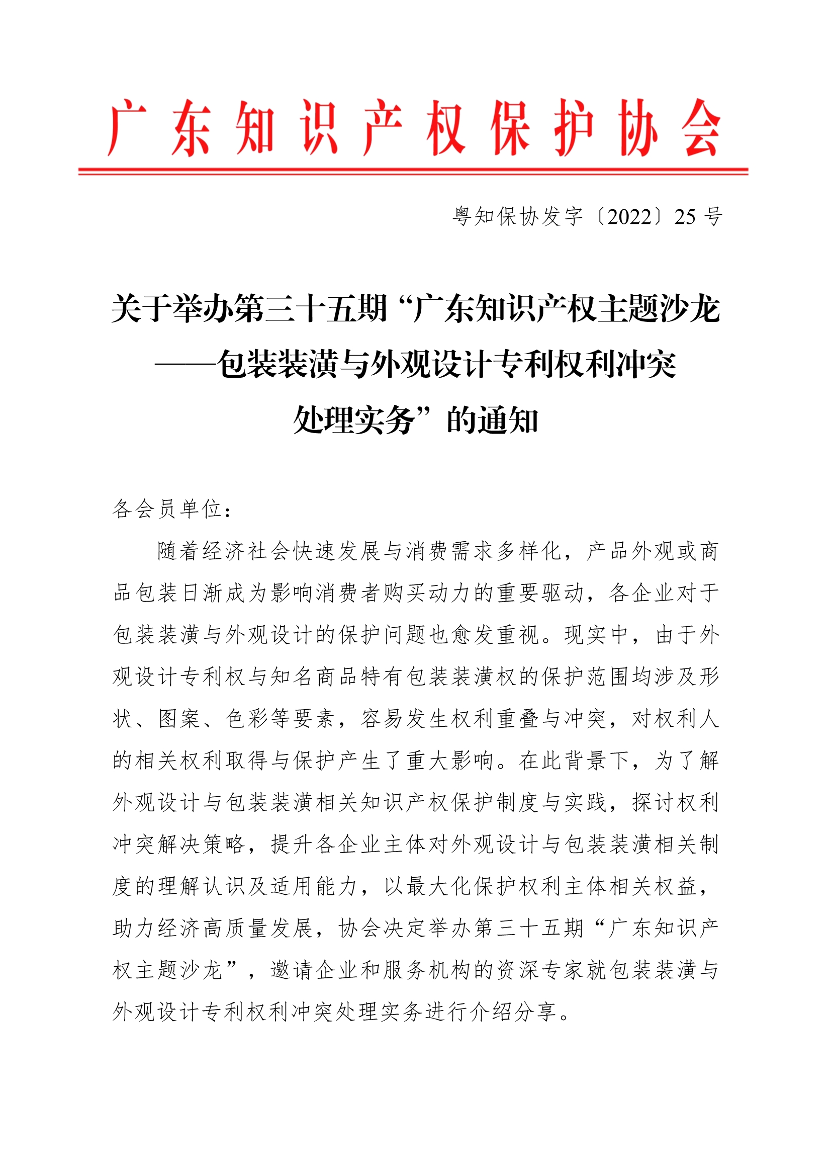 粤知保协发字〔2022〕25号-关于举办第三十五期“广东知识产权主题沙龙——包装装潢与外观设计专利权利冲突处理实务”的通知
