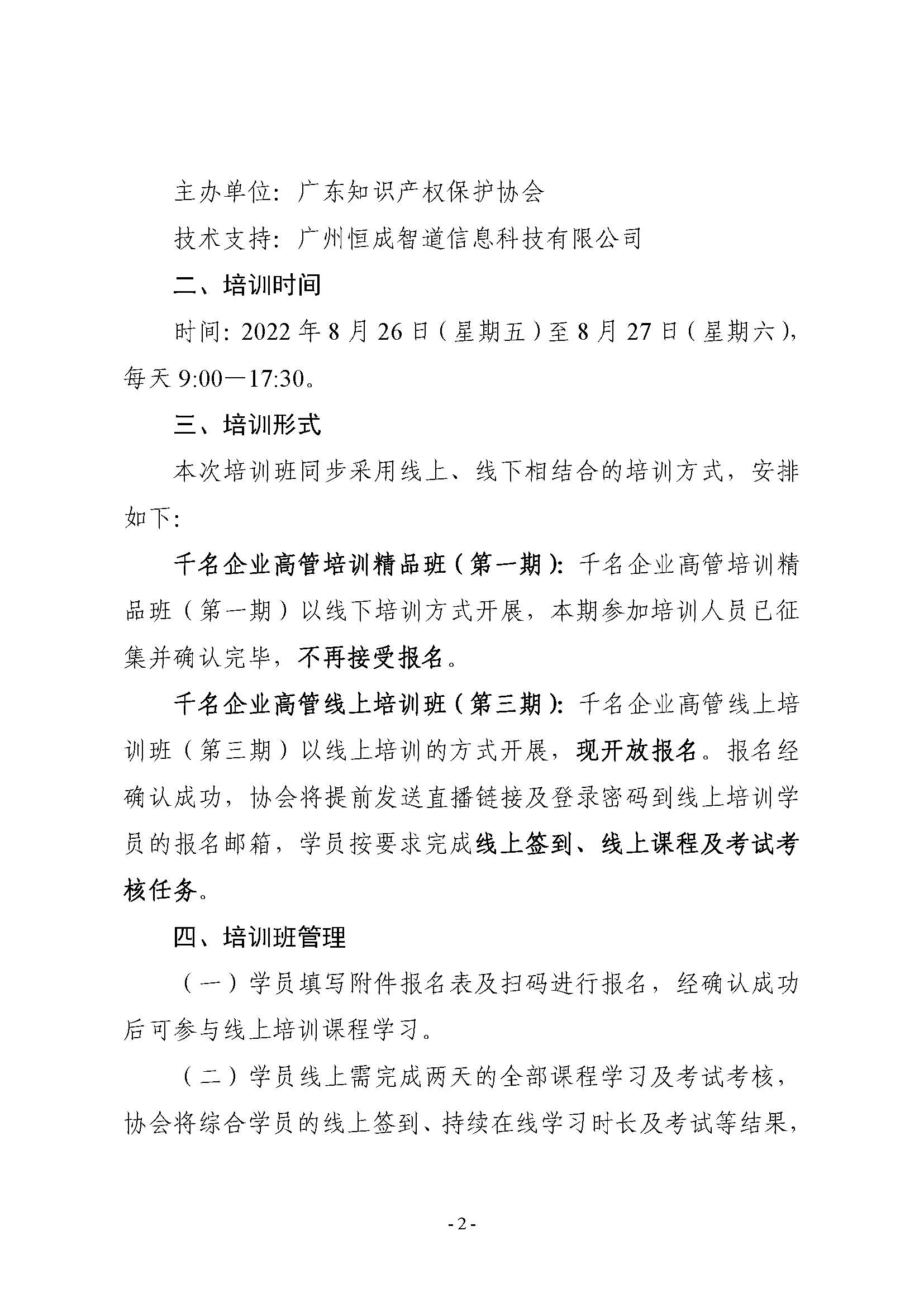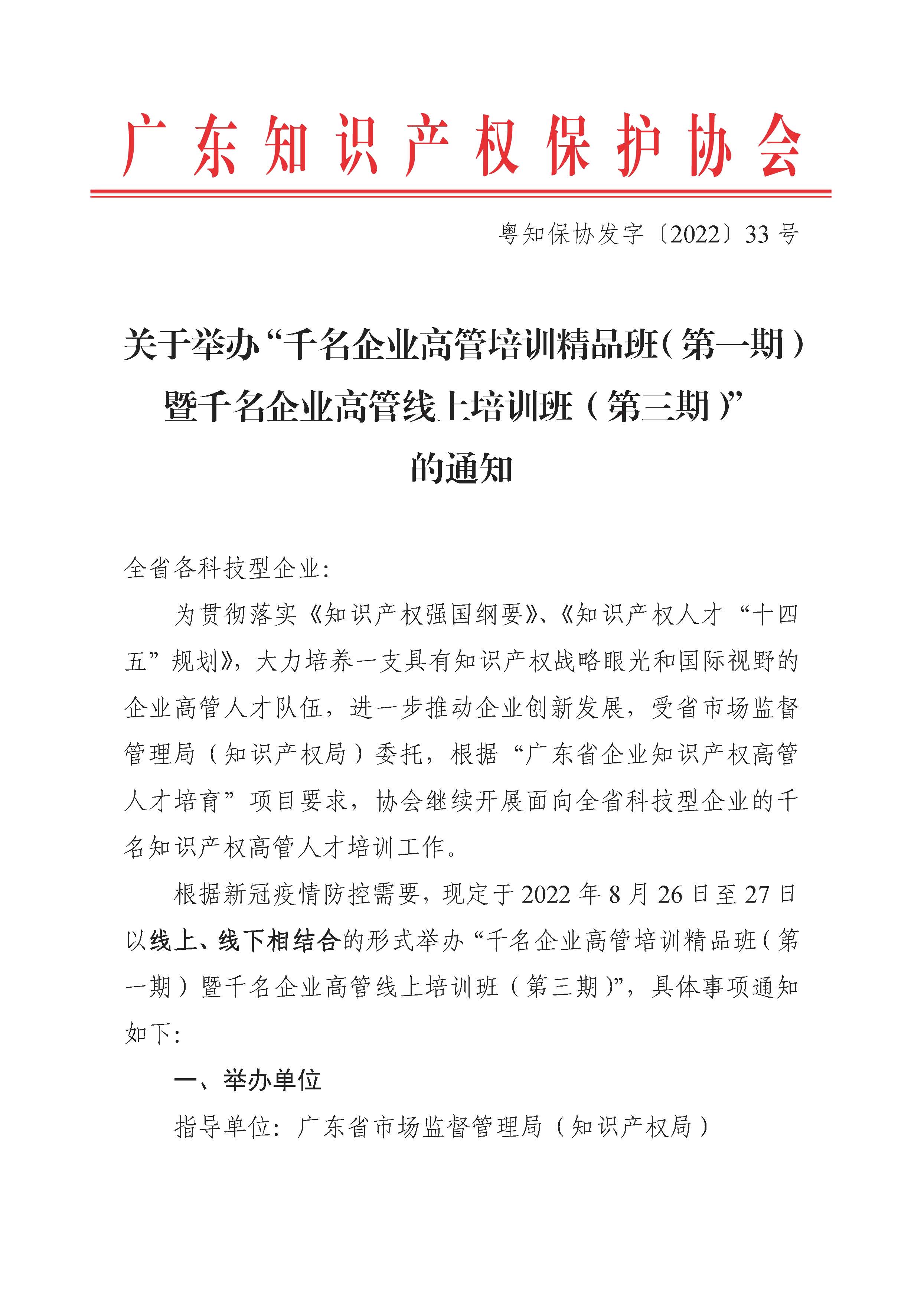 粤知保协发字〔2022〕33号-关于举办“千名企业高管培训精品班(第一期)暨千名企业高管线上培训班(第三期)”的通知