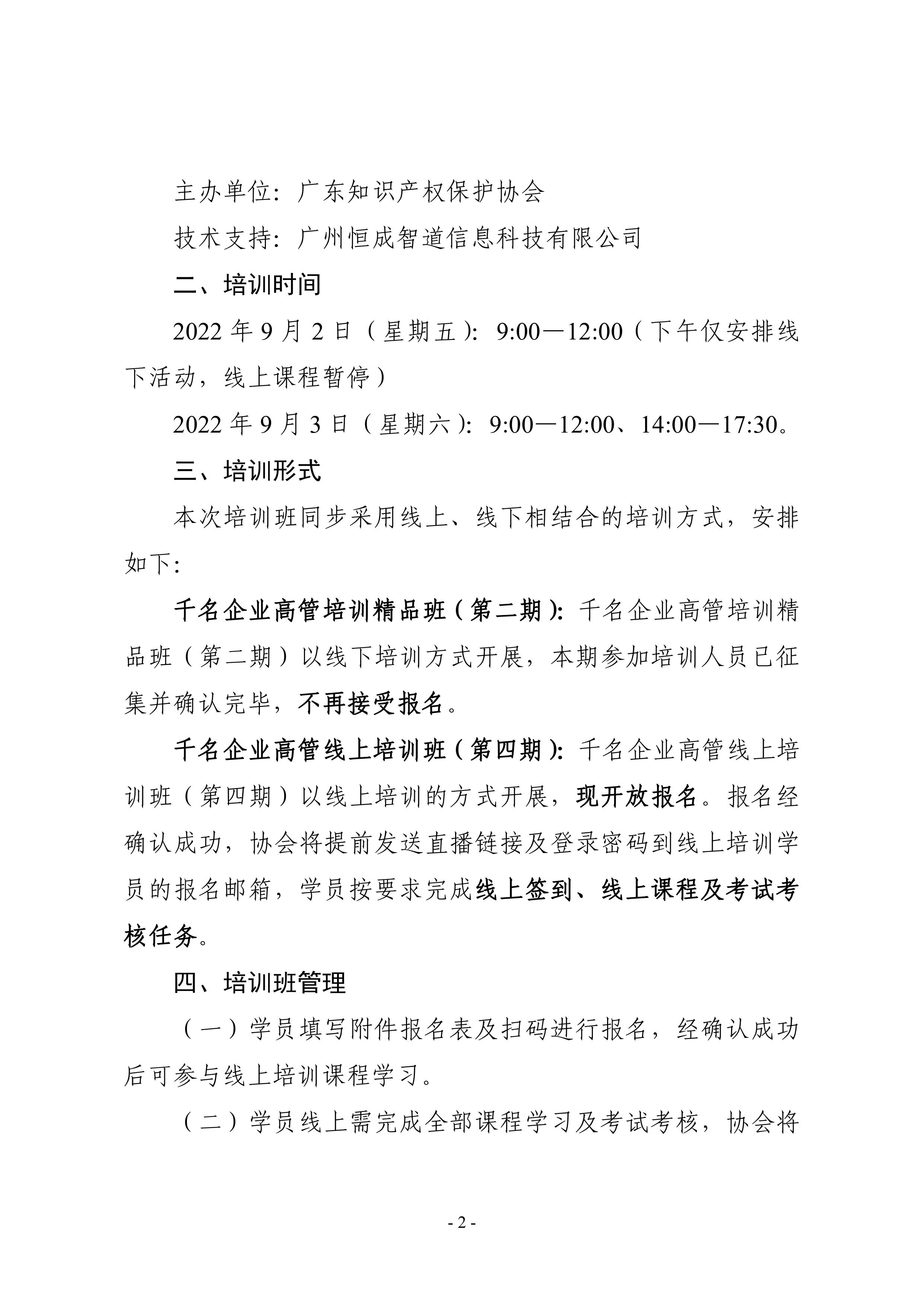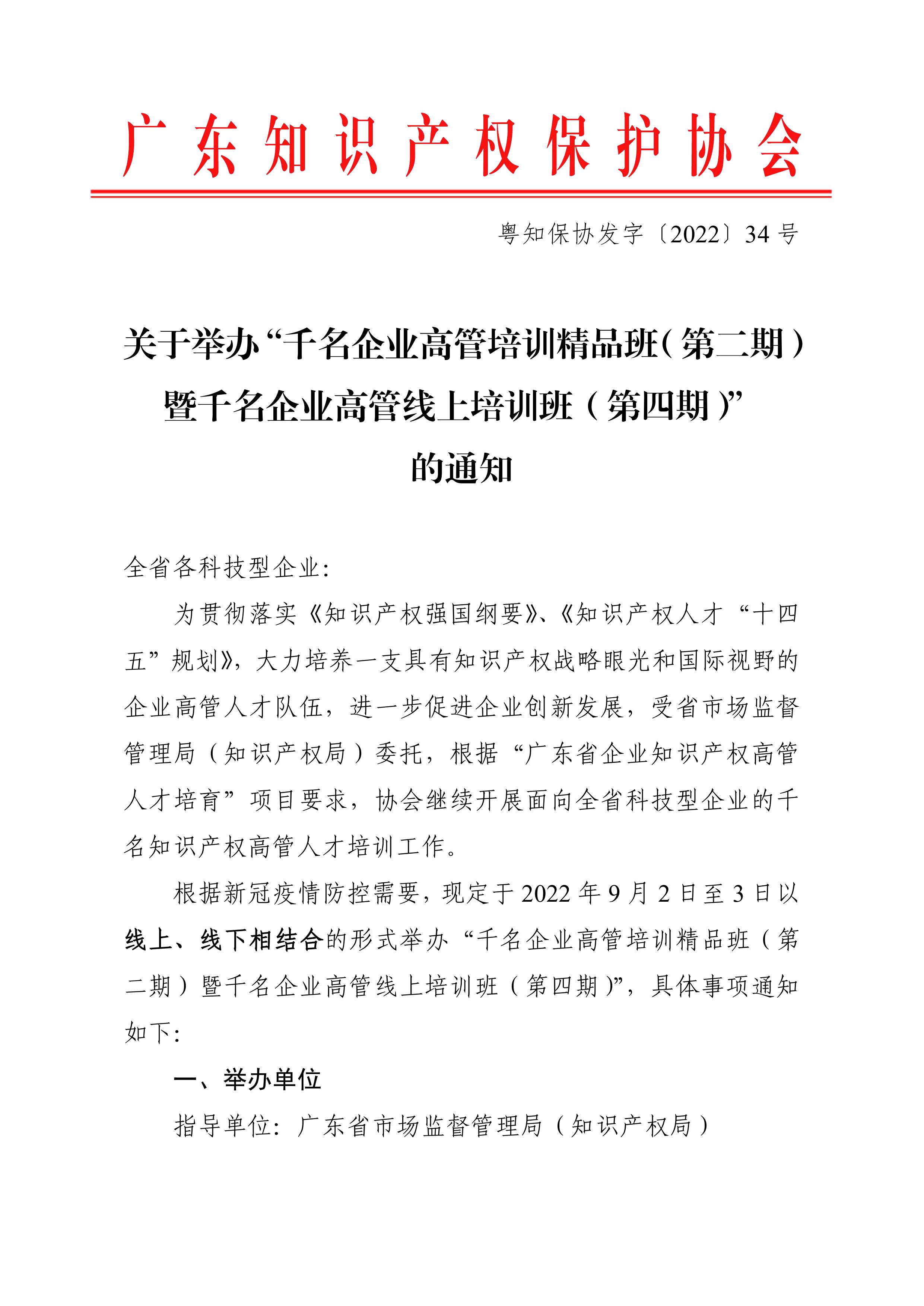 粤知保协发字〔2022〕34号-关于举办“千名企业高管精品班(第二期)暨千名企业高管线上培训班(第四期)”的通知