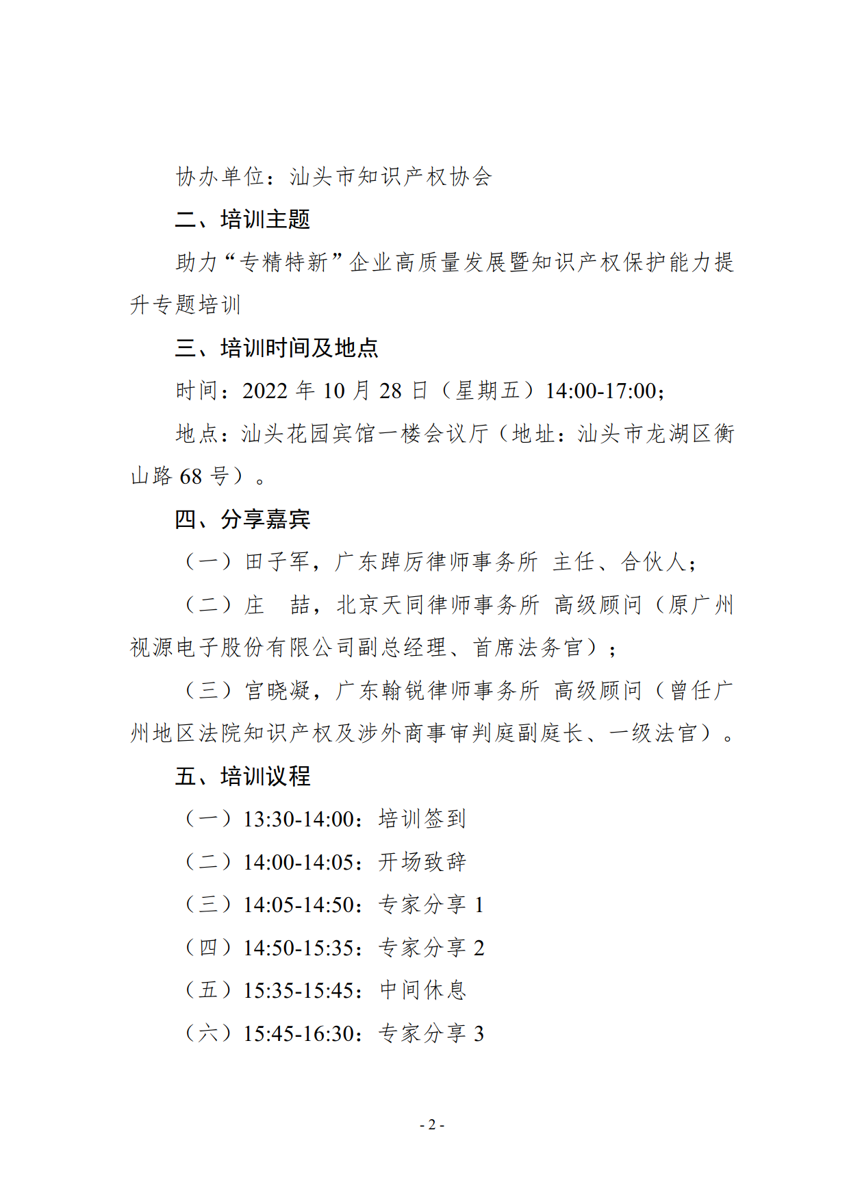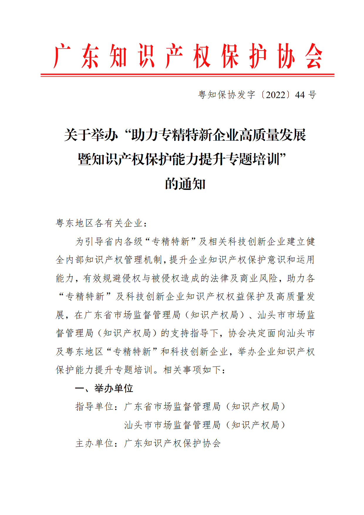 粤知保协发字〔2022〕44号-关于举办”助力专精特新企业高质量发展暨知识产权保护能力提升专题培训”的通知