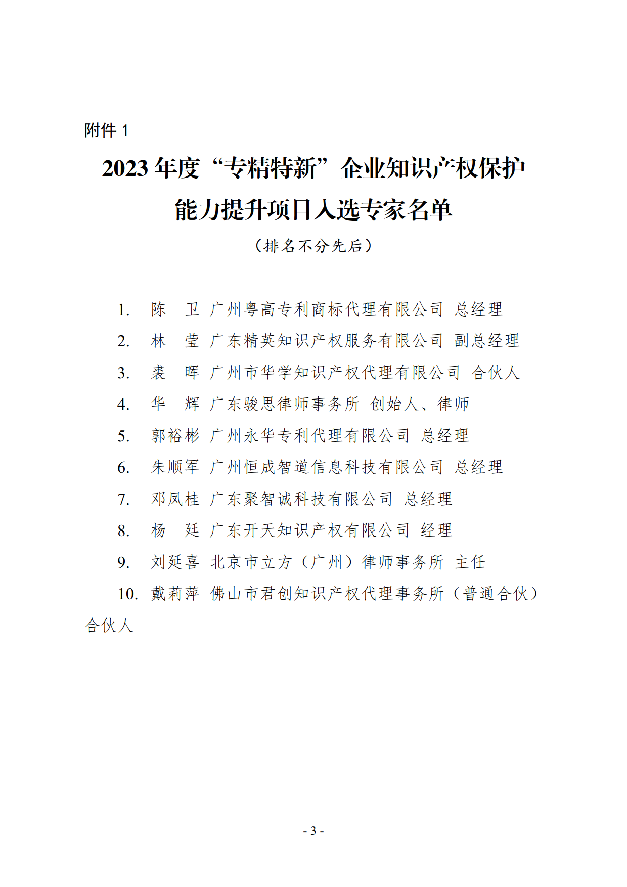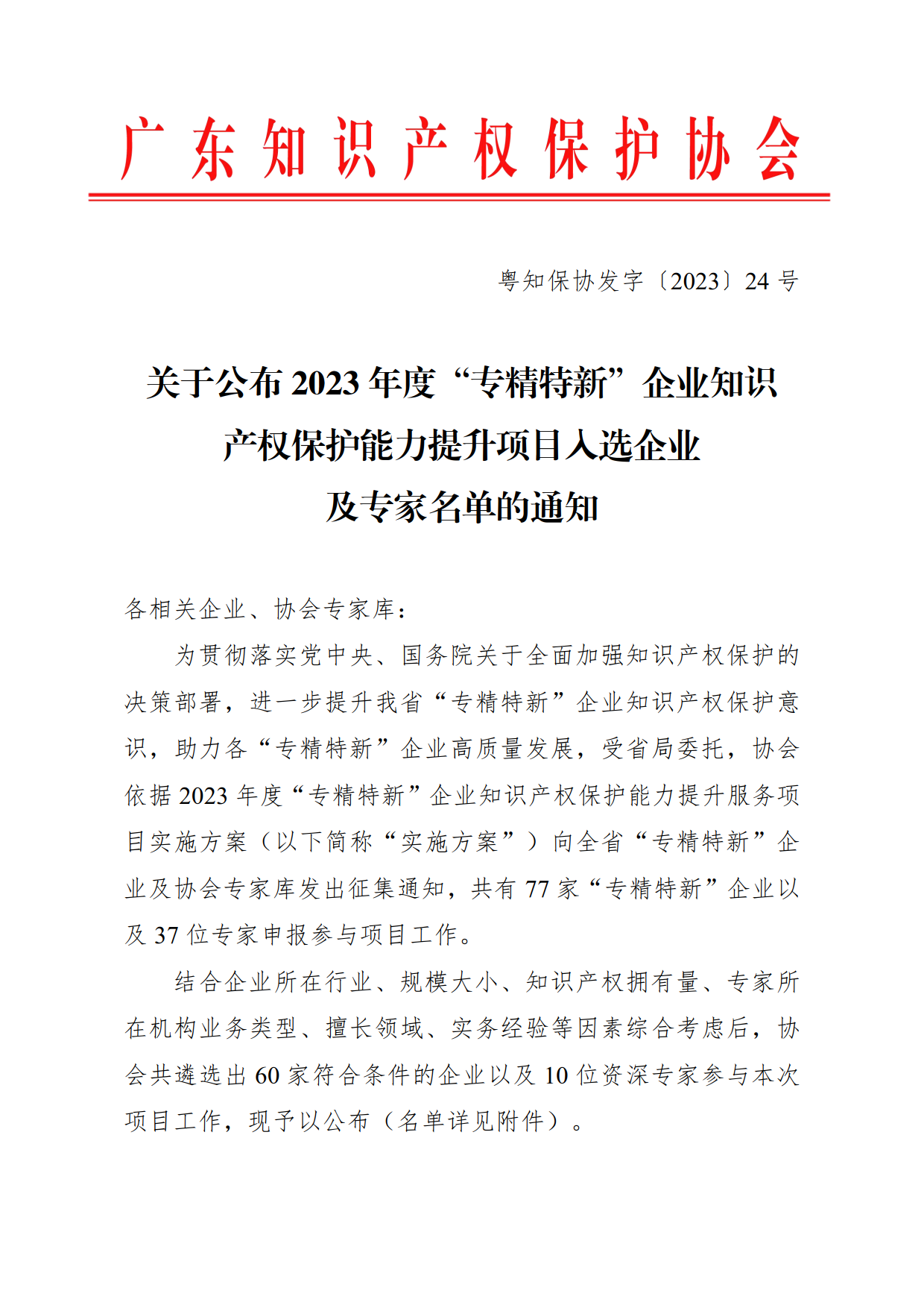粤知保协发字〔2023〕24号-关于公布2023年度“专精特新”企业知识产权保护能力提升项目入选企业及专家名单的通知
