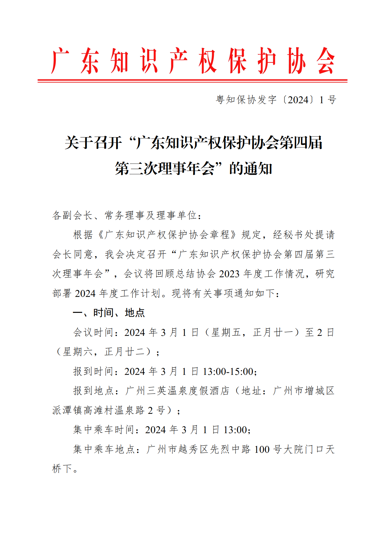 粤知保协发字〔2024〕1号-关于召开“广东知识产权保护协会第四届第三次理事年会”的通知
