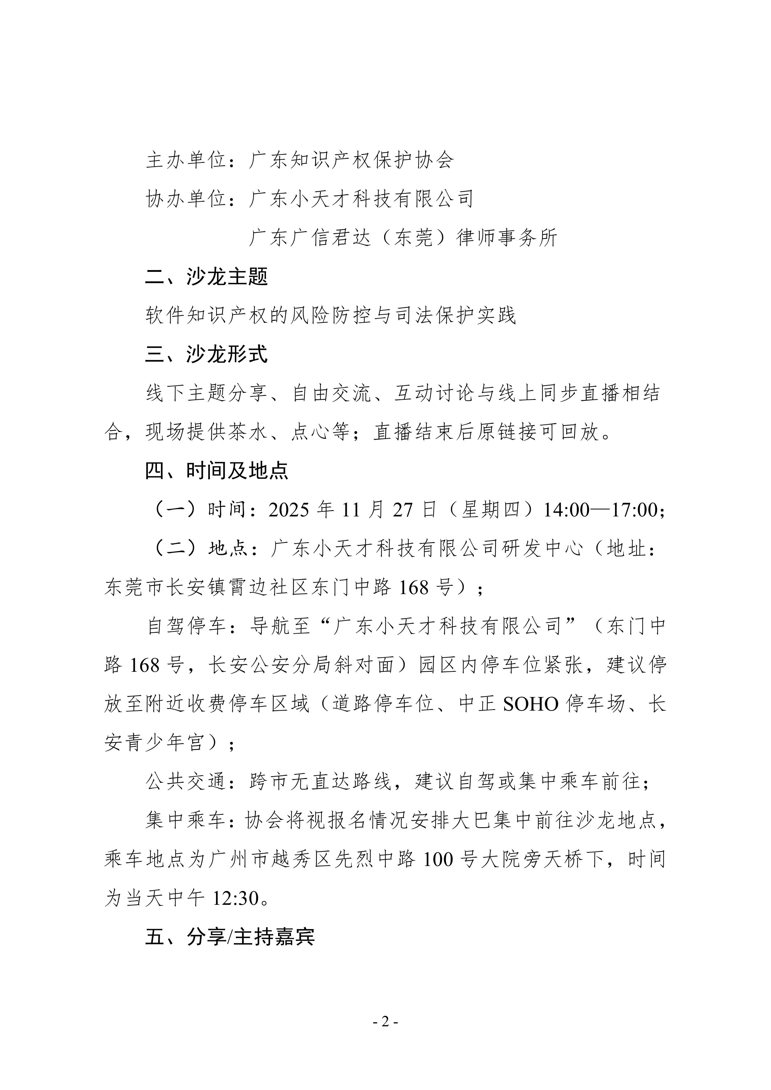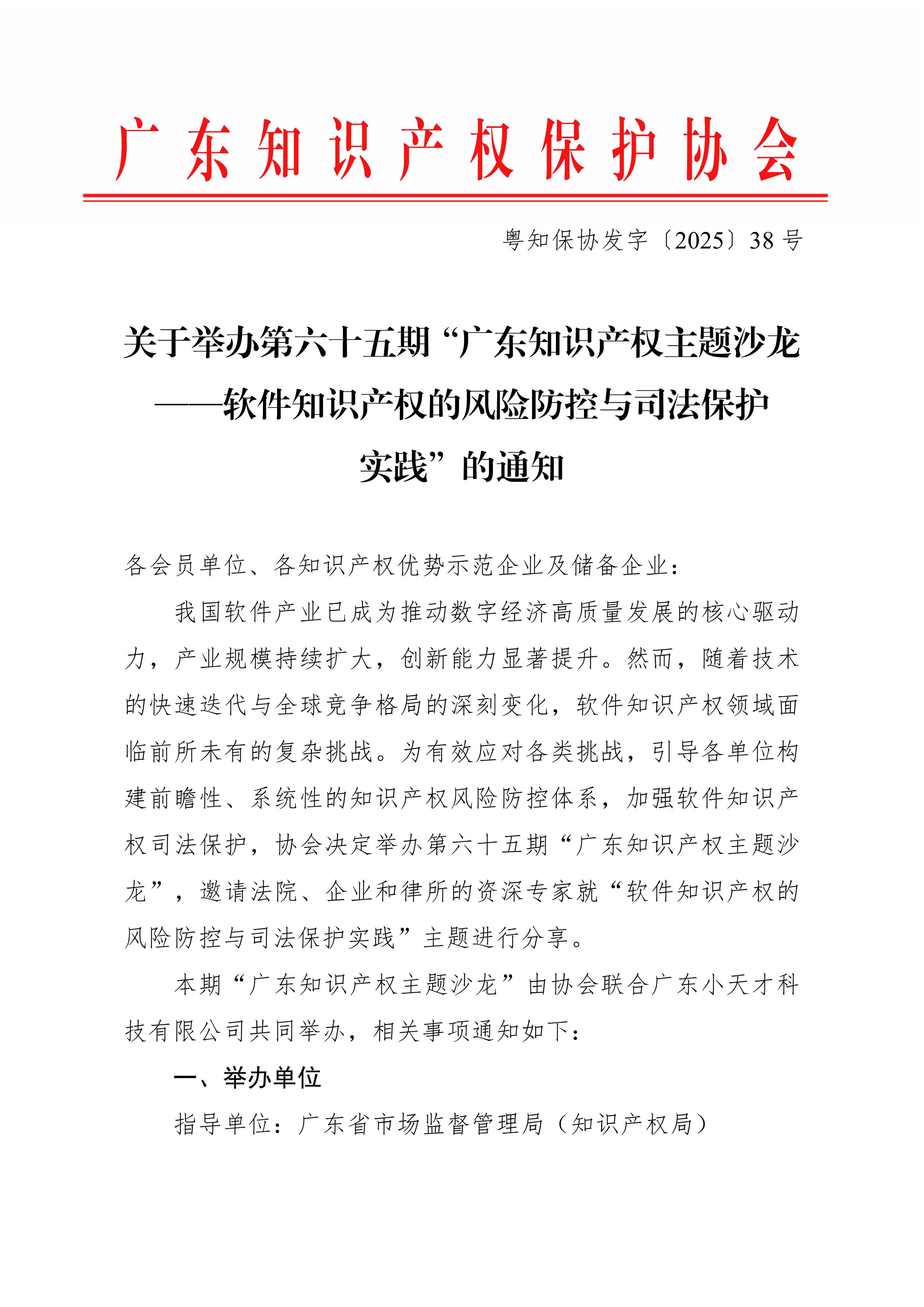 粤知保协发字〔2025〕38号-关于举办第六十五期“广东知识产权主题沙龙——软件知识产权的风险防控与司法保护实践”的通知