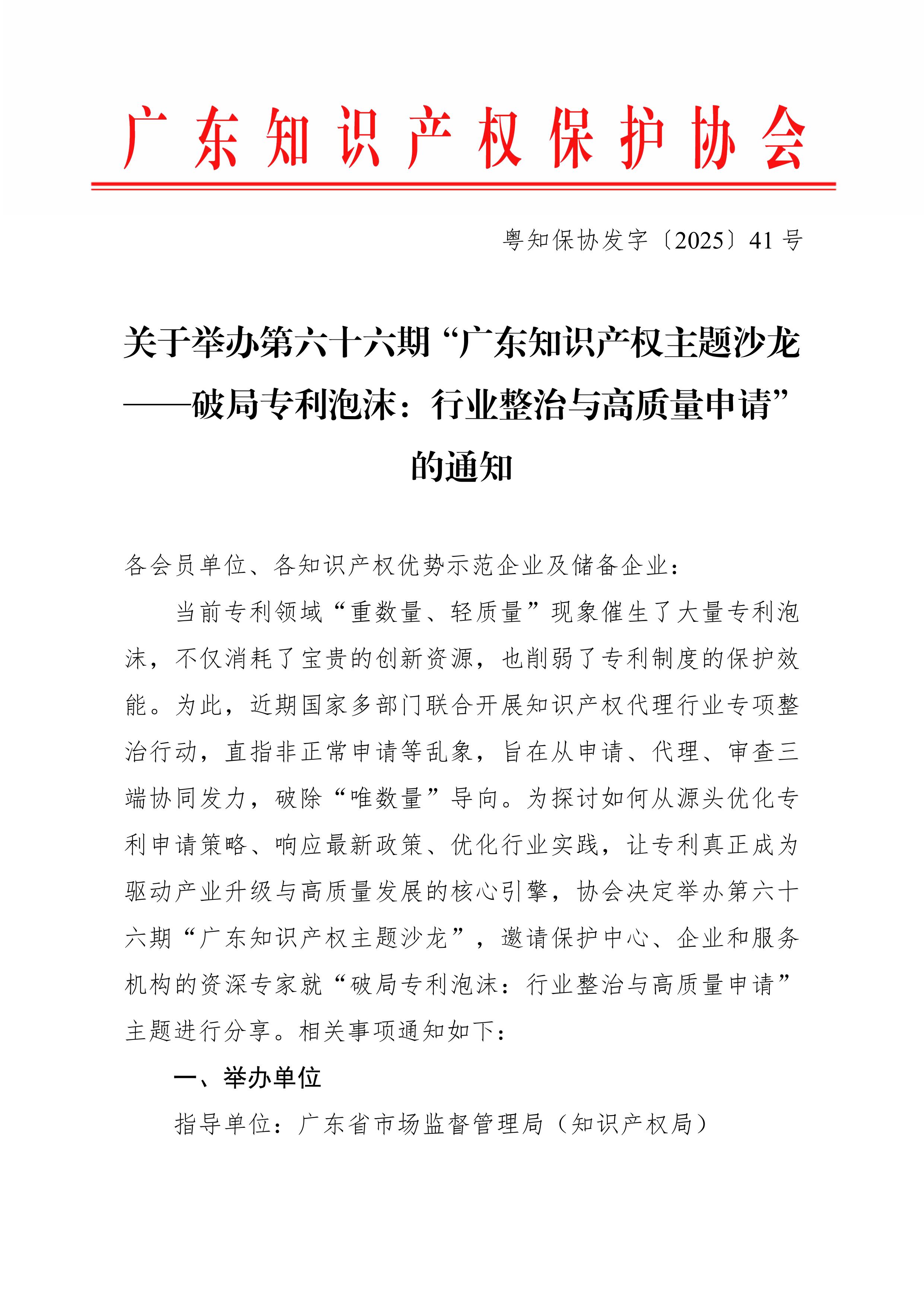 粤知保协发字〔2025〕41号-关于举办第六十六期“广东知识产权主题沙龙——破局专利泡沫:行业整治与高质量申请”的通知