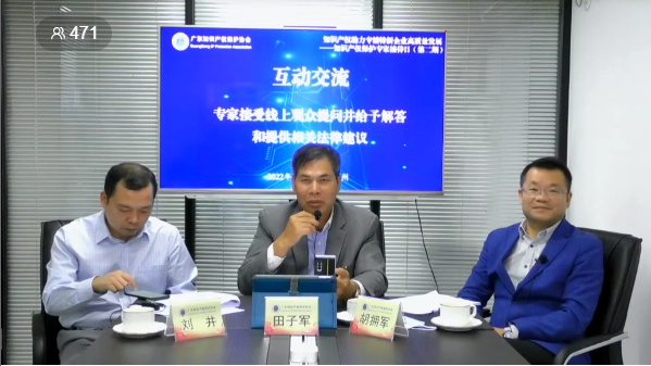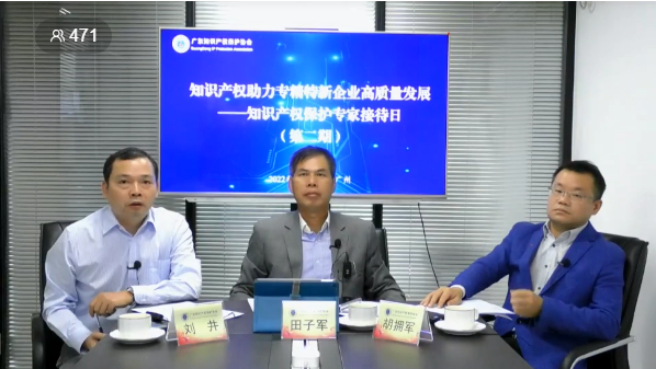 本期接待日为知识产权保护专家接待日系列活动第二期,邀请了广东踔厉律师事务所主任田子军,广东品安律师事务所主任刘井,广东聚创智合知识产权代理有限公司总经理、专利代理师胡拥军以及广东朗乾律师事务所律师、专利代理师朱鹏,就承接协会“知识产权保护能力提升”项目服务企业过程中总结的经验及企业普遍存在的知识产权保护方面问题进行分享,并接受线上观众提问给予解答和提供相关法律建议。