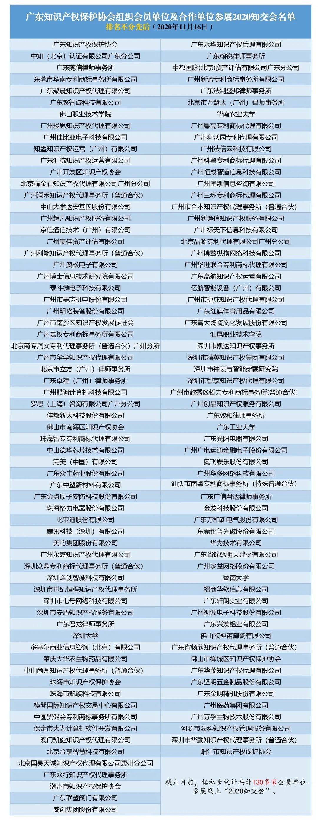 截止目前,据初步统计,广东知识产权保护协会会员单位中的企业、高校、知识产权服务机构、律所等共计130多家会员单位参展线上“2020知交会”。统计名单如下: