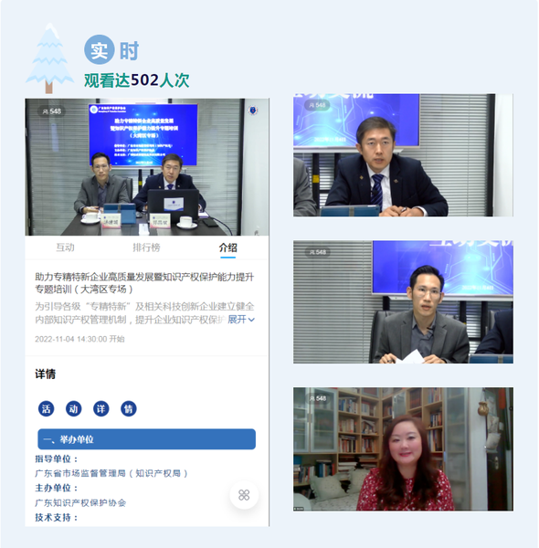 粤港澳大湾区“专精特新”和科技创新企业及相关单位知识产权人员超502人次观看了实时直播节目,直播平台有回放功能,目前观看达548人次。