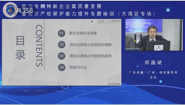 郑昌斌主任以近期的真功夫系列商标无效案为例,分别从商标禁止注册的绝对事由和相对事由两个方面,分享了商标注册禁止性规定的理解与适用情况,并就国家知识产权局商评委裁定阐述个人观点与看法。