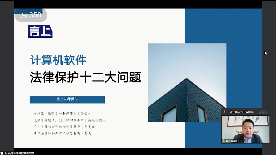 吴让军律师分别从计算机软件的权属及内容证明、计算机软件侵权的取证问题、计算机软件侵权的认定原则、实质性相似判断等方面介绍计算机软件法律保护相关问题。