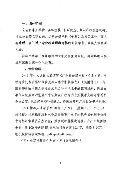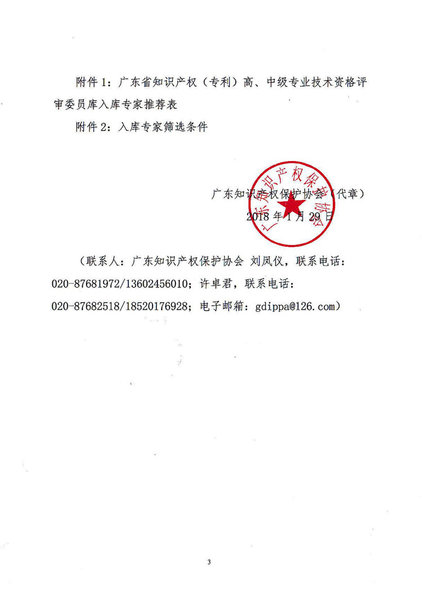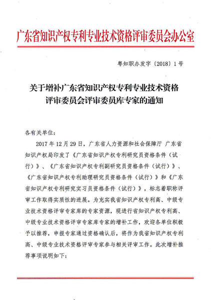 粤知职办发字〔2018〕1号-关于增补广东省知识产权专利专业技术资格评审委员会评审委员库专家的通知