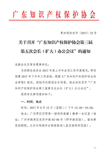 粤知保协发字〔2017〕22号-关于召开“广东知识产权保护协会第三届第五次会长(扩大)办公会议”的通知