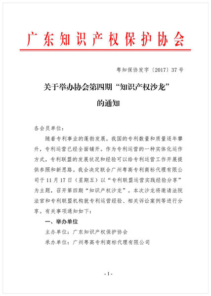 粤知保协发字〔2017〕37号-关于举办协会第四期“知识产权沙龙”的通知