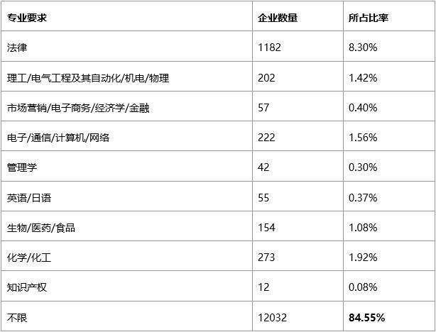 图表显示,企业的招聘需求对求职者专业无要求的企业占比高达84.55%;其次为法律专业,所占比率为8.3%;明确要求知识产权专业的企业数最少,所占比重为0.08%。