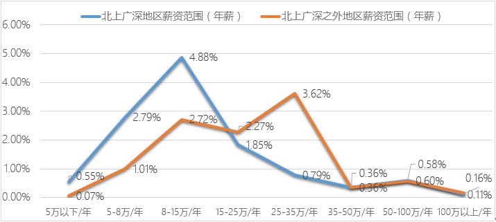 通过分析,可以看到内陆城市25-35万/年的薪资比例相较一线城市更高,表明内陆城市目前更缺乏高端知识产权复合性人才。