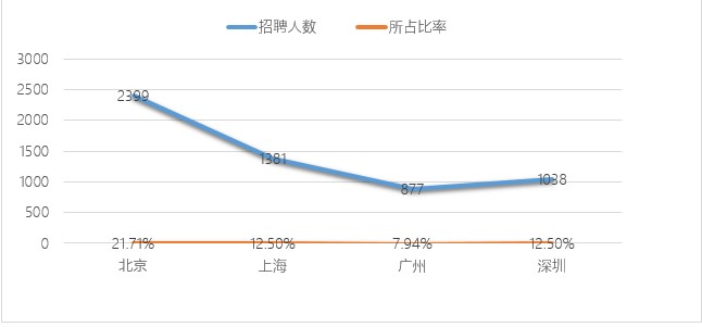 其中北京招聘人数最多,占招聘总人数21.71%;其次为上海,占比12.5%;然后是深圳与广州。本月北京为知识产权人才提供的机会最多。