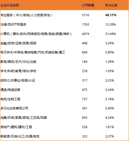 专业服务行业的知识产权需求量最大,所占比例为40.17%,这与知识产权的实用性相吻合;其次计算机(硬件/软件/网络游戏/电商/系统/数据/维护)所占比例居第二,因为这些行业与知识产权关系密切;