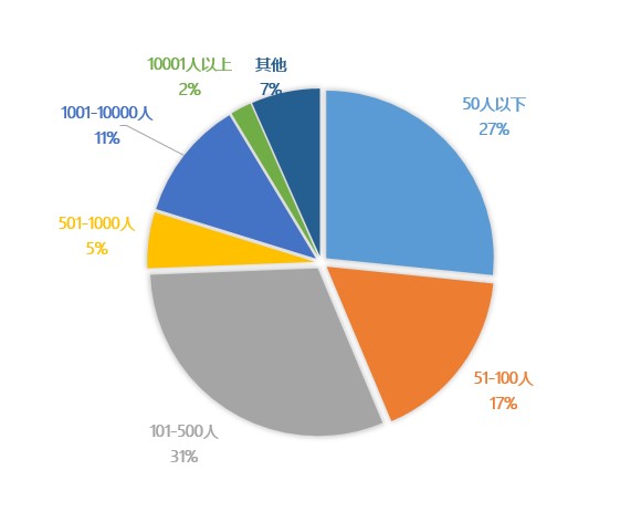 10001人以上公司数量最少,所占比例仅为2.02%,与万人以上企业本身数量较少有关。