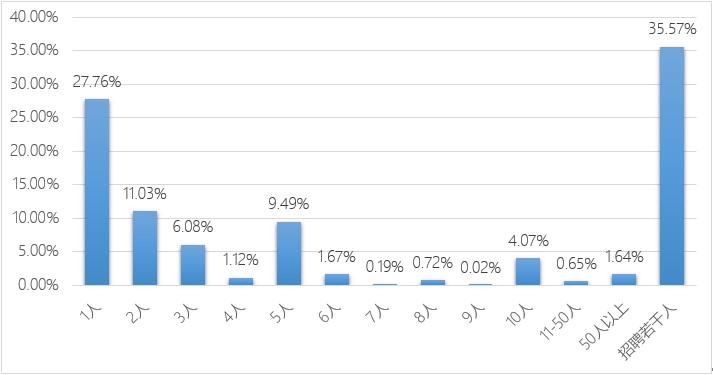 说明较多企业对知识产权销售型人才需求量较大。招聘1人的公司多数是招聘专业岗,说明企业在在招聘专业岗位时需求比较明确。